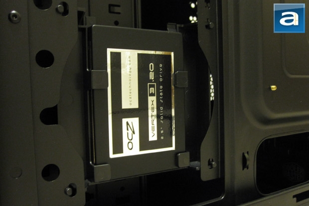The next task is to place the hard drives in. The HDD itself is easy to slot in, especially with the tool-free bracket. After a quick mount and turn of the switch on the bracket, it was put in place. SSDs also extremely easy to put in, as the 2.5” quick mount proves to be quite useful. For demonstration purposes, I have used the OCZ Vertex 3.20 240GB. The mount is secured by a single plastic tab that keeps the SSD/laptop drive from sliding about. I would say that the tab feels secure, but over time, the tab may weaken, and may even snap off.