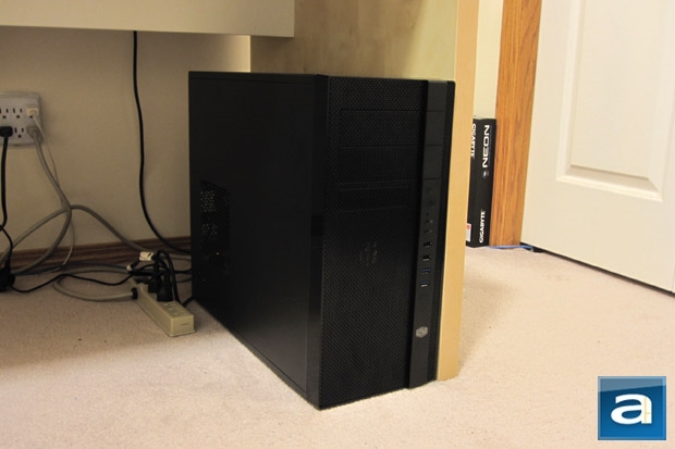 After connecting all the power cables and plugging everything in, I pressed the small circular power button, and the system came alive. The power button lit up and the fans started to whir around. The fans are not adjustable and stay at a constant rotational speed. According to the standard APH Networks sound scale, where 0 is silent and 10 is the loudest, the Cooler Master N400 would come in around 3.5/10 in my personal opinion. This is with the two stock fans going. I must say, sometimes my laptop makes louder sounds than what I heard from the tower. These numbers are a bit better than some other budget cases, which is another deserving feather in Cooler Master’s cap. If you are interested in quieter fans, the stock 120mm can be easily swapped out with third party ones, but be warned -- you might spend more money on them than your entire case.