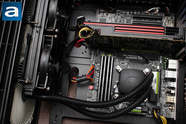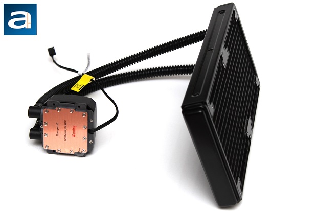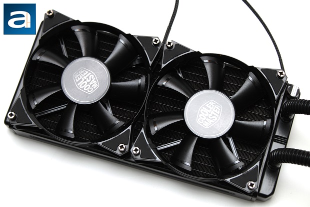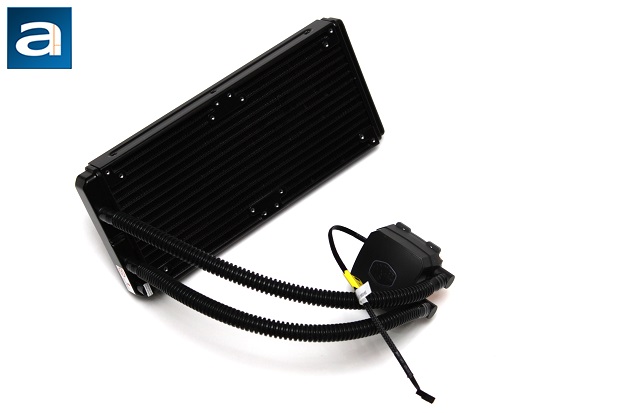 As you can see in our photo above, the hoses, radiator, and pump are already pre-assembled in a closed loop design, so you don't have to worry about the mess involved in assembling one yourself. Its looks are simple and clean, and are especially pleasing to look at through a cleanly designed windowed chassis. You will notice there are only two included fans, which are most optimally used in a push configuration. Cooler Master's logo is stamped on the pump itself, and a white strip will glow once everything is hooked up and powered on.