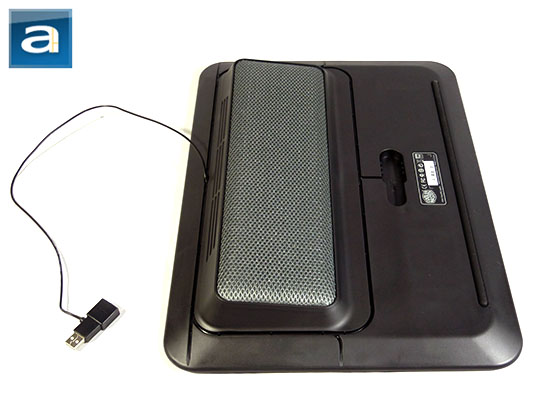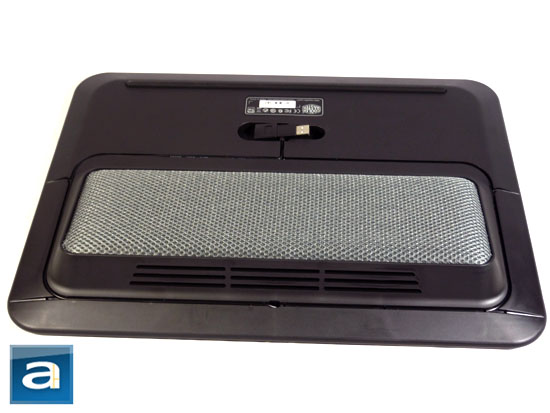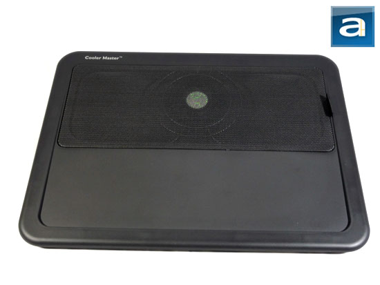 First off, what is a LapAir? Is it like when you are getting a lap dance on an airplane? Well, if you are, I would like to know where you booked that flight! More seriously, 'LapAir' suggests that it involves your lap, and 'air' seems to come from the fact this is an air-based laptop cooler. Not that I have really seen any other kind, making it a little pointless to state it. Then again, calling it a NotePal Lap would not make any sense. If the Cooler Master NotePal X-Slim is considered the slim one, then this guy would be its not-so-slim big brother. The NotePal LapAir is all black, minus the Cooler Master branding, of course; and it is, for the most part, plastic. The top half has a metal mesh cover, and there is a raised 'soft' padding along the bottom side. Cooler Master, for some reason, decided to attach a tag to the right side of the metal mesh cover. Considering you can clearly see the Cooler Master trademark at the top left corner, I would have to say this is a case of over-branding, and worse off, an annoying tag sticking up on the front. I have a laptop cooler here, not a new shirt. On the plus side, the Cooler Master NotePal LapAir is certainly large enough to handle 17 inch laptops, but it appears to be a bit too large for 11 or 12 inch notebooks. Although it isn't exactly portable due to its size of 430 x 316 mm, it would work perfectly fine around the house.