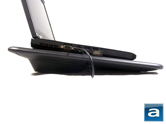 The left and right sides of the Cooler Master NotePal LapAir are completely identical. This cooler isn't adjustable, and is basically designed to be used as is. Fortunately, you can route the USB cable through a wonderful groove, so that it comes out nicely on either side. Depending on where the USB ports are on your laptop, you can choose between having the cable come out the middle of the sides, or towards the rear. I'm going to be a bit critical here and state Cooler Master has gone overboard with the length of the wire. It is designed so that no matter which side you're choosing to route the wire, you can easily re-clip the USB connector. That part is great, but when you have a cable that is roughly two feet long coming out of the bottom side, it leaves a significant amount of loose wiring kicking around. The last thing I want when I have a laptop on my lap are loose cables around my chair. This isn't an overly huge issue, but certainly something worth noting. The Cooler Master NotePal X-Slim had a much better wiring solution than the one used for the NotePal LapAir. I'm slightly disappointment considering the LapAir is actually a bit more expensive.