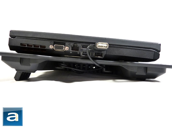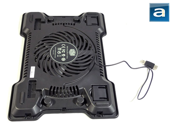 On the right side, you can also see two wire hooks, in case you happen to have a laptop that would have a wiring job done on the left side. The Cooler Master NotePal X-Slim provides cable management on the underside as well, to allow it to be connected to either the left or right side of your computer. This is a handy little feature, I might add -- as it means you have the flexibility to plug it in to wherever it suites your laptop, and keep it securely attached as well as hidden from view. The lack of USB ports on the cooler itself is both a good and bad thing. Since the USB cable does come with an extender, it is almost as if the cooler doesn't take up a USB slot; however, many coolers come with at least two additional USB ports, making the cooler act almost as if it were a USB hub. On the other hand, considering the design goal was to be lightweight and slim, just having an extender is acceptable; not to mention the X-Slim is only about $20 at press time. The part that gets to me is the only way to turn off the cooler is to unplug it from the laptop, and regardless of how lightweight you are trying to make the cooler, this is just a downright annoyance. Any device that uses power should come with a switch -- you wouldn't build a computer that can only be turned off by pulling the plug, so why should a notebook cooler be any different? This wasn’t the best design choice, as anything being plugged into the USB extender must also be removed and reattached to your laptop when you want to turn off the NotePal X-Slim.