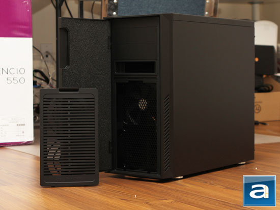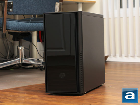 Like the Fractal Design Define XL and Define R3 cases designed primarily for the quiet computing market, the Cooler Master Silencio 550's exemplary clean design is carried forth by the use of a full height black door in front. It is pretty much completely blank; with the exception of the Cooler Master logo in front. However, unlike the Define series cases, the Silencio 550's door features a high gloss surface instead of a matte finish. That said, the Cooler Master case still looks like a mini fridge -- a quick glance at our image above quickly confirms this assertion. Don't get me wrong though. It is not a bad thing. I would much rather have this than cases with an alien face or so-called dragon inspired designs, but that is just me. Do keep in mind a glossy piano finish means a hardcore fingerprint magnet, so do keep your buffing towel next to you if you like shiny things.