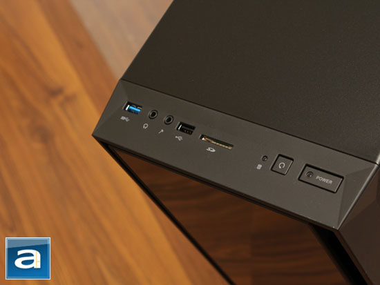 Rather than setting the front panel connectors behind the door, Cooler Master made a wise choice in putting them at the top of the Silencio 550. I have to say this is truly one of the best 'front' panel configurations I have seen -- starting with one USB 3.0 port at the left, followed by a 3.5mm headphone and microphone jack, one USB 2.0 port, one SD card slot, hard drive indicator LED, reset button, and power button. The power button has an integrated blue status LED, while the hard drive indicator LED as aforementioned flashes in cool white. Everything is appropriately labeled for the end users. I have never owned a case with an integrated SD card slot, and with the popularity of digital cameras, I was more than glad to give up one USB port for the card reader. And rectangular buttons? What I can say, this is definitely quite unique.