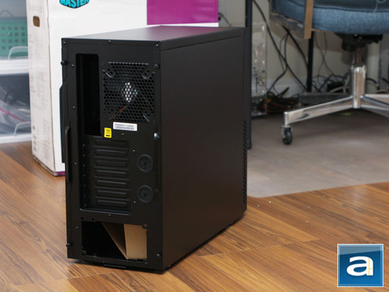 Painted black to match the rest of the chassis, the back of Cooler Master's Silencio 550 is pretty much standard for a case with a bottom mounted power supply bay. To give it some description in text, we can expectantly spot an included black colored 120mm fan placed adjacent to the motherboard I/O backplate, with two pre-drilled water cooling holes on top of each other right under. Both side panels are held closed by two thumbscrews each. Even the ventilated plates enclosing the seven expansion card slots are painted black, as shown in our photo above. As aforementioned, Cooler Master's Silencio 550 ATX case has a bottom mounted power supply bay.