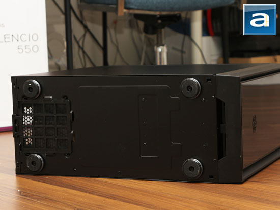 Shiny aluminum legs with rubber bottom resembling those commonly found on home electronics can be seen on the Cooler Master Silencio 550 as well. Combined with a modest 1 cm rise above the residing surface, like every other air intake, the company has a fan filter here to reduce dust from entering your power supply -- especially of those featuring a bottom mounted fan. The filter can be detached from the chassis externally, so you can clean it any time you like without removing your power supply. A bottom air intake vent that works along with side vents for the front panel fans can be found here as well; used to improve airflow when the case door is closed.