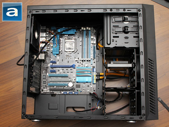 The Cooler Master Silencio 550 is quite a roomy ATX chassis to work with, so it really does not matter if you install the power supply or motherboard first. Out of personal preference, I got my ASUS P8P67 PRO installed first. Everything is quite simple; openings on the motherboard tray is not necessarily abundant, but they are present where you need it. The rectangular opening adjacent to the ATX 24-pin power connector on the motherboard can be used for cables leading into the 5.25" bay components as well. There are no openings next to the motherboard Serial ATA connectors near the bottom right corner of the motherboard. Although you can simply run corresponding cables directly into the hard drive rack area, having a dedicated opening here will allow for a much cleaner installation. But that is just nitpicking compared to the biggest problem in the Cooler Master Silencio 550. You see the USB 3.0 cable? If you don't want to physically modify your case, then that's the best you can do. I think if someone at Cooler Master actually tried to build a computer inside the Silencio 550, they would have figured this problem out already.