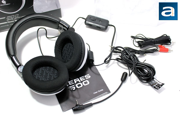 There is one thing that brings me great joy when it comes to packaging, and that is the lack of blister packs. Even when I purchased my Sennheiser HD 439, it came in the worst blister pack ever made. It had to be opened with a knife. So without a knife in my hand, I opened up the Ceres 500 to see what I would get. Once again, packaging is pretty much the same as the Ceres 400, with the headset fit in a plastic shell to hold the whole product in place. Taking everything out, we have four items to note. The first is the Ceres 500 headset, along with a 3m cord permanently attached to the left ear. On the cord is also the in-line remote. The second item is the detachable microphone, which attaches on the left side of the headphones. The third item is an RCA-to-3.5mm (male/female to female) adapter cable, which is used when plugging the headset into a video game console. Finally the fourth item is a 2.5mm to 2.5mm, male to male, microphone cable, used specifically with the Xbox 360, and it plugs from the inline remote to the controller. There is also some light documentation for specifications, and a quick guide to plugging the headset into the different devices.
