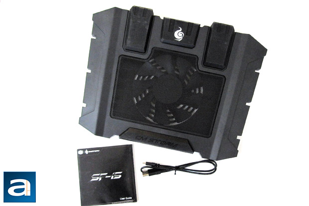 Open up the retail packaging, and we can pull out the Cooler Master Storm SF-15, wrapped in a plastic bag, and lined by foam inserts to prevent any damage to the cooler while moving it around. In addition to this is included a single 65 cm USB 2.0/Mini-B cable, and a small user guide. The user guide has very little information and repeats the specifications and features. However, it is rare that users even look at user guides for peripherals like this. When I first opened the box, the laptop cooler felt rather small, even for a 15.6" model, but more on this later.