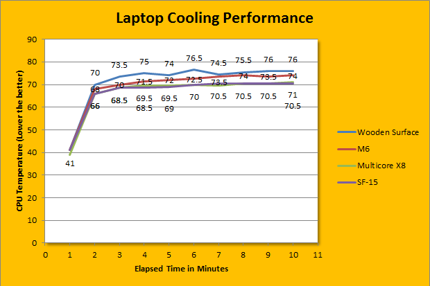 The results were obtained and plotted on the line graph above with a one minute polling rate. For reference's sake, the temperature measurements from the Deepcool M6 and the Deepcool Multi Core X8 are also displayed, in addition to placing the laptop on a bare wooden table. As you can see from the graph, the SF-15 was practically matching toe-to-toe with the Multi Core X8, with only a few instances of having a lower temperature by approximately half a degree. Something I do find interesting is that the Multi Core X8 achieved these temperature readings with four, albeit smaller, fans, while the SF-15 only required a single 160mm fan. In comparison to the wooden table, the SF-15 was able to reduce five degrees Celsius on average. Of course, the Cooler Master Storm SF-15 cools mainly the bottom of the laptop and not just the processor, so please do keep that in mind as you interpret our graph. Just because the CPU temperature does not show a drastic change, it does not mean the cooler is not doing its job.