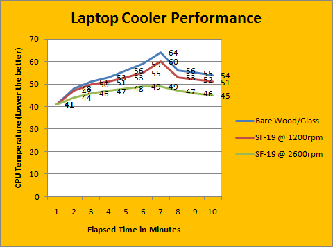 The results were obtained and plotted on the line graph above with a one minute polling rate. It was quite apparent that the Cooler Master Storm SF-19 Strike Force did keep temperatures of the laptop lower throughout the test, as heat was blown out and drawn away from the system. However, when the fans were left on low speeds, there was less heat being dissipated, hence, the higher temperatures. Nevertheless, running the SF-19 at low fan speeds would still result in improved cooling performance for your laptop.