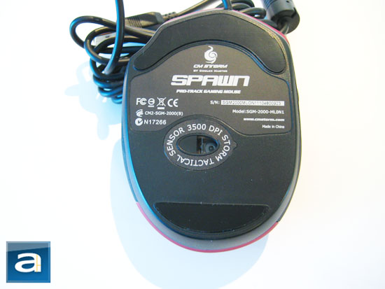 Turning the Cooler Master Storm Spawn around, the backside of the mouse is shown to us clearly. As with the rest of the mouse, this part is also constructed out of plastic. Since this unit is a production model, the usual sticker with the logo, model number, and the usual certifications are all notably there. Two strips of Teflon, which is very common for gaming mice, can be found at the top and bottom of the mouse. Teflon is used for its excellent glide characteristic and overall smoothness for tracking. Based on theoretical calculations and previous experience with Teflon feet used in various mice we have tested or used in the past, it should be safe to assume that the PTFE feet should last for as long as you use your mouse. That is not to mention this will probably be before realistically reaching those five million button presses.