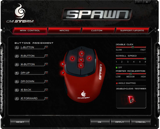 As previously discussed, the driver software for the Spawn can be obtained online from Cooler Master's website. Installation is a breeze, and is very straightforward to make it quick and painless. Software wise, the Cooler Master Storm Spawn has some very standard features for a gaming mouse of this caliber. This includes sensitivity settings, key bindings, to some slightly more advanced features such as macros. As expected, the CM Storm color scheme is found in the software by taking on the black/gray background with red and white text. The main control page also includes a picture of the Cooler Master Storm Spawn with numbers to label the buttons to bind them to different functions. The main screen allows the users to set buttons bindings, change double click speed, modify scroll speed, set pointer acceleration and angle snapping. The Spawn also features an onboard Sentinel-X 32 KB memory that enables users to save macros onto the mouse. Sadly, there is only one profile, but it should be enough for most casual gamers.