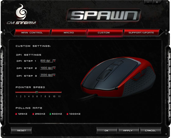 The Custom tab features the DPI stepping settings. Although it appears to have a way to customize them, there are only three options -- and that is 800, 1800, or 3500 dpi. This seems a little counter intuitive to have this as a customization option, but to only leave three real choices to select from with nothing in between. The Custom page also sets pointer speed and polling rate. Back to the topic of macros, the 32KB of onboard memory can be used to store different macros. The creation process is very simple; starting by clicking New Macro and entering a name. Next, the user clicks Start Record, presses the combination of clicks or key presses, and clicks Stop Record when done. This saves the macro to name it is assigned, and then can be bound to a button on the mouse. Unfortunately, the macro setting does have a flaw, as it does not allow a user to edit a macro name without deleting it. In addition, there is no way to edit a macro without rewriting the whole thing. There is also a limit of up to five key presses and five key lifts for each macro. If you need to use more than that, it may be wise to grab another mouse. The Update button allows the user to see a tab where there are two buttons; one for support that leads to the Cooler Master forum, while the other one automatically looks for updates to the firmware, and prompts the user about updating to the latest version.