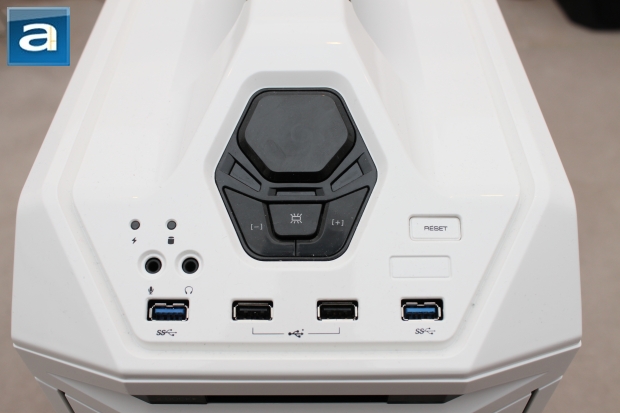 The Cooler Master Storm Stryker has a control panel front, with a large button to drive to warp speed. On a serious note, the large button actually powers up the machine, while the side buttons change the fan speed. LED lights are near the buttons to indicate fan speed levels. In addition to the large black buttons, on the far right is a "Reset" button. While many people may not use this very often, it is quite useful for those times when you rage on your computer, or if someone else rages at your computer after you run over them while gaming. As for input/output ports, there are two USB 3.0 ports, two USB 2.0 ports and two 3.5mm audio jacks. Curiously enough, where an eSATA port was on the Storm Trooper, there is only a location where the port cutout is supposed to be -- kind of like cars with fake buttons for lower trims. While it cuts down on production costs, it is rather cheap looking, and should either be implemented with the eSATA, or removed altogether. In addition to all this, there are two LED indicators: One to indicate power, and the other to indicate hard drive activity. However, they should actually remove this, as the power button itself lights up to show whether the computer is on or not, making this somewhat redundant. Rather, they could combine the power button's LED with the HDD activity, while removing the two indicators.