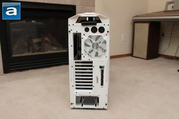 Rotating to the rear end shows some useful features. At the top are three holes covered with rubber grommets. Below is the rear exhaust fan, which allows for 140mm or 120mm fans, depending on which one you are fans of -- no pun intended. The Cooler Master Storm Stryker comes with a 140 mm fan attached, so you probably won't need to swap them out. Next to the exhaust fan is the motherboard I/O panel; below are nine PCI expansion slots. This, in addition to the large case itself, will allow for quad SLI/CrossFire configurations without having to even worry about size constraints. At the very bottom is the power supply bay, and even future down below the power supply bay is another sliding dust filter, which makes dust cleaning even easier. Everything here is expected, but very typical of any other computer case.