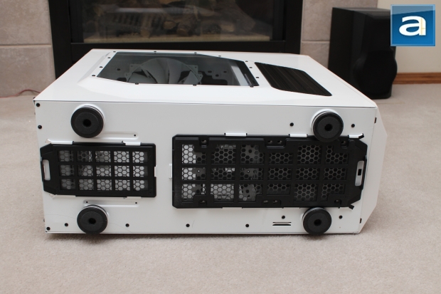 Flipping the case onto its side reveals the bottom of the chassis. Four feet are located on each corner of the case. These feet are padded with a rubber base, with a silver lining on each foot. The great thing about this is that the feet are approximately 20mm off the ground, which allows for ventilation underneath the case. This means that if the user is to implement bottom mounted fans, they can rest assured knowing that there is enough space under the case for air flow. As clearly shown, there are also two removable air filters much like at the top of the case that allow for easy cleaning while keeping dust out of the bottom. All in all, I really like the external looks. With all said and done, it is now time to crack open the case, and peer into the deep abyss.