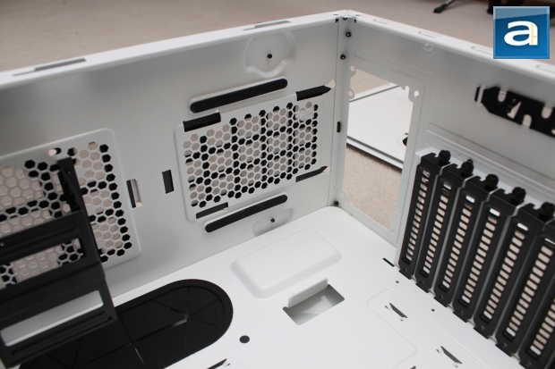 As you can tell, higher end cases separate themselves from value-based chassis by doing the little things right. A common problem in lower-priced towers is the lack of vibration absorbing materials inside the chassis. During operation, parts that may not be secured tightly will rattle around, causing vibrations that spread around the chassis. This will create annoying sounds, which would annoy any avid computer user. As you can see in the picture above, black rubber padding has been added to various places, including underneath the power supply. This ensures that the PSU has a good cushion to sit on, which will dampen any vibrations. A second feature the Cooler Master has included is the separate dust filter for the power supply. As seen in the Storm Trooper, the ability to separate the filter means it is easy to clean. You can see there is an opening right above the power supply, which allows for easy convenience in wiring. This means that rather than wiring components over the power supply to the motherboard, wires can be brought through the back. One drawback by the power supply is the 2.5" bracket used for mounting solid state drives. This is placed right in front of the power supply. While the idea is innovative and ingenious, this means that the supply is limited to a certain length. When consumers are to purchase enthusiast cases as such, it is expected that they would also dish out more on higher-end power supplies, which often are larger than value-oriented PSUs. In other words, your ballin' power supply could possibly not fit.