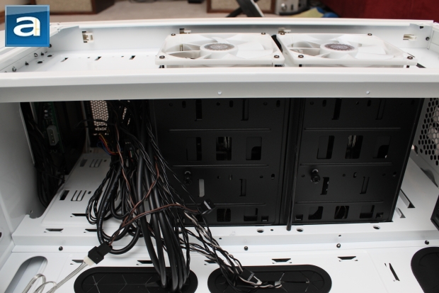 Finally, we reveal the case's dark side... or rather, the side that is usually hidden. As seen above, the wires hanging off the back of the motherboard tray is cray cray. These wires cut down on the available working space, even in a case as large as this. On the good side, there is plenty of space for cable management, and drive bays are extremely easy to access. Each drive bay comes with a holder for easy insertion and removal of disk drives. The wires are fed through large rubber grommet holes, which is an easy but effective way to hide cables. This also directs air to where it should be going, rather than losing air to various openings. There is, however, one large flaw: The rubber grommets themselves are rather flimsy and fragile. After pulling and tugging lightly at them, it is easy to see that with a little bit more force, the grommets may tear. This can be improved by using thicker rubber. However, this may inadvertently cause greater stress due to greater frictional forces.