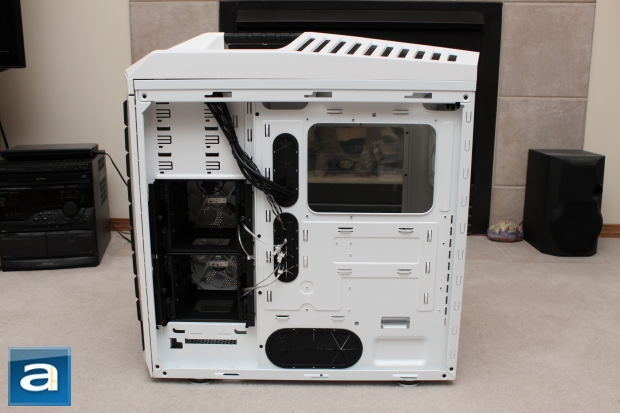 Thankfully, removing the side panel is painless. Two thumbscrews come off by hand power, and panels slide off smoothly. Now, I can truly see what is in Mr. Stryker. One of the first features that will be noticed immediately is the side mounted fans attached to the inside of the chassis rather than the side panel. This means that removal of the side panel will not require other fan disconnections. While common on many high-end cases, it is these features that set the Stryker apart from any value-oriented chassis. As seen in the picture above, this tank of a case has very little space restraints. The Cooler Master Storm Stryker can support up to XL-ATX motherboards, and allows for quite a lot of room when working with standard ATX and mATX boards. Internally, the case can hold up to 322mm in length, allowing room for the latest (and largest) graphics card.