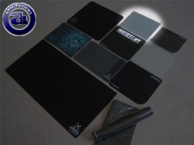 Size comparison with other mousepads. From top left: SteelPad QcK+, Corepad Magna, Corepad Eyepad S, Corepad Victory, Icemat 2nd Edition, SteelPad 5L, XTracPads Hybrid, Corepad Eyepad M, XTracPads Ripper XXL. For your interest, the one rolled up unopened is the Corepad Deskpad XXXL and beneath it is a Corepad Eyepad XL. The Corepad Magna is pretty good in terms of area for mouse usage.