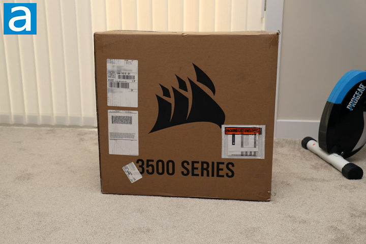 Today's review unit of the Corsair 3500X ARGB arrived from a distribution center in San Bernardino, California, presumably leased by Corsair. Looking into the location, there are connections to Hewlett Packard, XPO Logistics, and GXO Direct, but it is not clear. Otherwise, the corrugated cardboard box arrived in excellent condition with no real signs of damage. It traveled with UPS and their Saver service to our APH Networks location here in Calgary, Alberta, Canada. As this is a computer case, it is no surprise the shipping container is also the retail container. However, what is surprising to me is the generic look of the box. Instead of having an image of the chassis itself, we just have a large logo on the side with the "3500 Series" label underneath. There are actually several cases in the 3500 lineup as intended by the name. Based on the box design, they likely all share the same box. To distinguish between them, there is a small colored label to indicate this is the white version of the 3500X ARGB. Otherwise, there is not much else to this exterior look, so I grabbed a knife to open up the box.