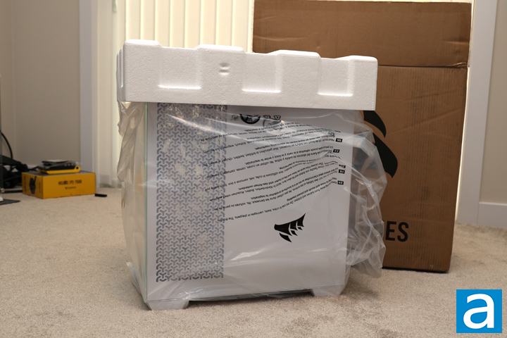 The Corsair 3500X ARGB is packaged in typical fashion inside a plastic bag and surrounded by two white foam blocks. The foam is not necessarily the best quality, as it easily breaks into small pieces, but thankfully the case is relatively light. The glass panels have clear wraps on both sides to prevent surface scratches that may occur while in transit. Otherwise, some light reading material can be found inside as well as a cardboard box holding the case accessories. This includes some white zip ties, a front panel I/O adapter, many different silver screws, and other mounting hardware.