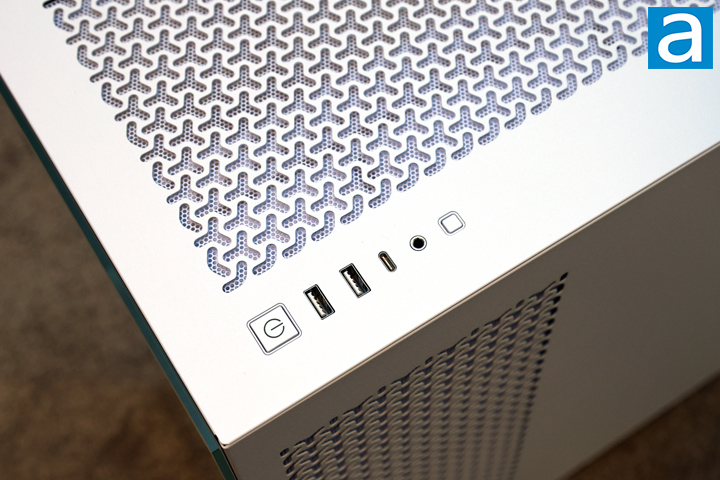All of the user-facing I/O is found on the top of the Corsair 3500X ARGB. This is lined up in one column of ports and buttons. At the very front is a square power button with a large power logo on it. This button illuminates white when the system is powered up. Next, there is a pair of USB 3.1 Type-A ports and one USB 3.2 Gen 2 Type-C port. Moving further up, there is a single combination 3.5mm audio jack for both headphone out and microphone in. Finally, there is a second smaller square reset button. Moving away from the I/O, you can see the top ventilation pattern. This stretches from front to back, and has a neat three-prong shape pattern. This pattern is consistent with the rest of the case. Underneath, you can peek and see there is a plastic mesh filter that is held in place by magnets.