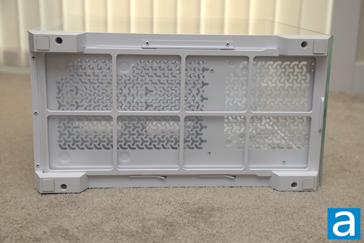 Taking a look at the flip side, you will see a solid steel panel with a row of ventilation at the front. This ensures air can flow in and out of the case when you mount fans or radiators there. Once again, this is lined with a mesh filter that is held on by magnets. The back panel has a pretty standard layout. At the top, there is a large slot for the motherboard I/O, with a ventilation area to mount a single 120mm exhaust fan or radiator. Underneath, there are seven expansion slots, which are all perforated for more airflow. Interestingly enough, these slots actually have screws surrounding it. Finally, at the bottom, there is an opening for an ATX-sized power supply.