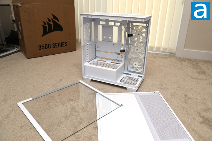 Opening up the Corsair 3500X ARGB is a matter of popping off the sides. Both of the side panels, as well as the front, are held on with ball-and-socket joints. The tempered glass has steel on its top and bottom with protruding stems. A small lip on the back makes it easier to get a handle on and pull off. Furthermore, once the sides are propped open, both remain balanced in place until you open it further. Both panes of tempered glass are 4mm thick without any tinting. As such, you will have easy visibility into your system. It also means you should tidy up your cables well. There is no padding between the glass or with the rest of the case, which would have been nice to cushion any hard surfaces making contact. This area does not overlap nicely like the Antec C5 ARGB with its beveled edges. Instead, there is a slight gap in between here with a bit more clearance at the bottom. It would have been nice to reduce this or at least maintain a consistent space between the two panes of glass, but this is what we have. Otherwise, the surrounding edges of the glass have a white frame, so you can hold the side and front without leaving noticeable fingerprints on the inside.