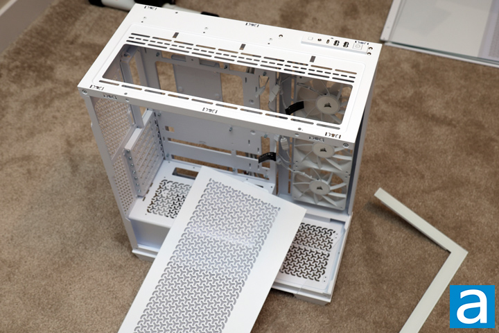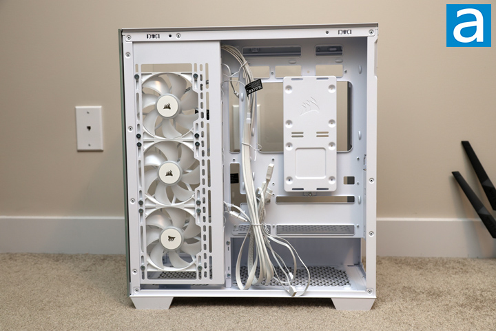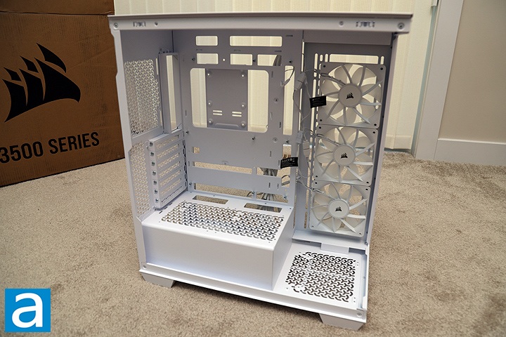 With all panels removed, you can see the Corsair 3500X ARGB maintains a mostly open-concept design, with a notable box at the bottom to separate the power supply from the rest of the build. Everything inside is white, which maintains a consistent color throughout. The primary screws, risers, and other mounting hardware are silver, which I think blends well with the rest of the enclosure. The paint on the panels is applied evenly and does not scratch off easily, which is good to see. The Corsair 3500X series of cases can accommodate E-ATX motherboards up to 27.7cm wide, which is pretty surprising given the overall compact footprint of the enclosure. In general, most of your system and its components will sit in this main area, with only the power supply and storage relegated to the back side.