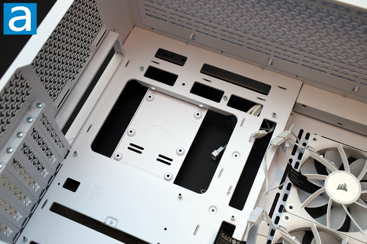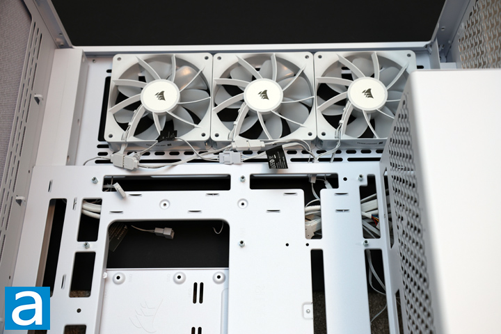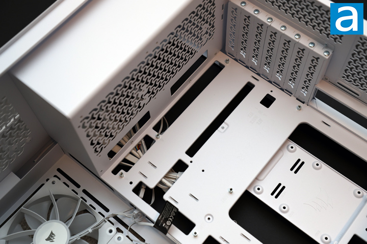 Flipping to the back, we have the cable management area. At the front, you can see the flip side of the fans, which nearly makes contact with the side panel. All of the routing is done directly behind the motherboard. All of the front I/O cables are white in color, which blends well into the rest of the chassis. At the top, we have a drive tray to mount your 2.5" or 3.5" drives in place. This is the only location for these storage options, which means you can install up to two of each size. If you have more of these storage drives, you may need to look at another case to keep them all in a single system. The tray stays mounted with a captive thumbscrew, which makes installation even easier.
