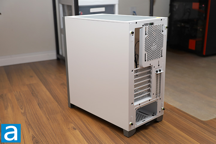 To remove the side panels, users do not need to use any tools. Four captive thumbscrews can be easily unscrewed and the side panels can be popped off. Note the side panels of 4000D White do not need to be pulled backward to remove them, since there is no rail mechanism to hold these panels. Each of them are held in place by a pair of ball-and-socket joints near the back and four clips near the front. A pop is all you need to get the panels off the chassis.