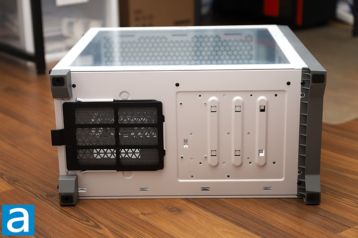 The back of the Corsair 4000D White, like the rest of the case, is simple and clean. There are four major sections at the back; namely, the power supply mounting area, motherboard I/O backplate, rear exhaust, and expansion card slots. The power supply is horizontally mounted at the bottom section of the chassis, which is a standard configuration. Since the power supply has already taken this bottom position, the motherboard can only be located above it, meaning the I/O backplate opening is at the top. There are seven conventional expansion slots available on the 4000D White, which, again, is standard for an ATX mid-tower. On the other hand, if you want to have a better view of your graphics card, it is also possible to vertically mount via the two additional vertical expansion slots by the right side of the back panel. As for the rear exhaust, as you can see from the photo above, there is a Corsair AirGuide 120mm fan included from the factory. This fan is smaller than the NZXT H710i's 140mm in the same location, considering both cases have the same width.