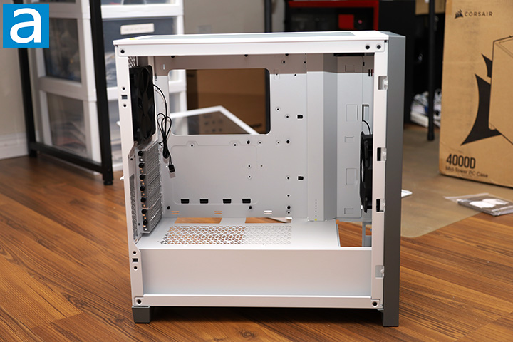Generally speaking, the interior design of the Corsair 4000D White is very good. All of the components you need for building a computer can be nicely accommodated and kept cool. The paint job quality of the interior is also good. More importantly, there are tons of room to route cables, and there are big openings to allow easy connections between the PSU and the motherboard.