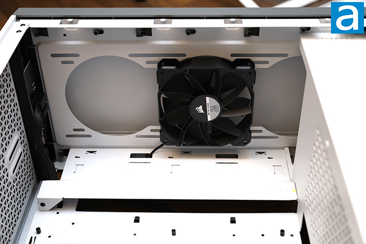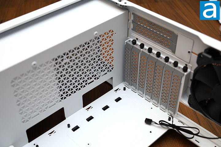 From the above photo, you can see there is a 120mm fan from the factory on the case’s rear exhaust opening. The fan is a Corsair AirGuide with the model number RWF0049. As I have mentioned on the previous page, this is a bit small given this is a 230mm wide case, and 140mm fans are not supported. This is a 3-pin voltage-controlled fan. A 4-pin PWM fan is preferred. The expansion slot covers of this chassis feature stamped holes to allow better ventilation, but I would prefer for it to be a solid piece for better dust prevention, since I really doubt it makes a significant difference to just have several small holes here.
