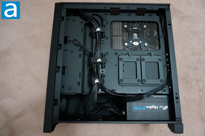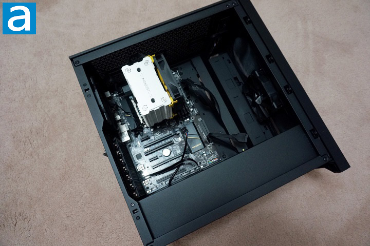 The computer building process was extremely enjoyable with the Corsair 4000D. It was easy to work with since everything was laid out in a pretty standard manner. I first installed the power supply into the PSU chamber. The power supply used in this computer was the FSP Hydro PTM 750W, which has a 135mm fan. Thanks to the grille, it is possible to have enough airflow for the PSU. When I installed the PSU, I found that the drive cage was a little bit too close to the power supply, which left little room for connecting the cables. I felt it was easier to just remove the storage cage first before plugging wires into the PSU. A Reeven Justice RC-1204 CPU cooler was mounted on my Gigabyte GA-H170-D3HP motherboard. The position of the motherboard tray opening of the 4000D matches perfectly for the CPU position, therefore my heatsink can be installed without any trouble.