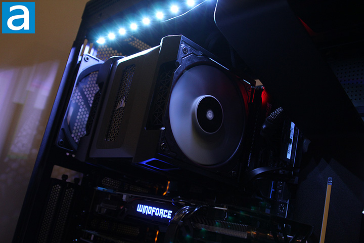 In the load test, the test processor, my Intel Core i7-6700K overclocked to 4.60GHz, generates quite a bit of heat that will push any cooler to the limits. The Corsair A500 came in 2c behind the NH-D15 chromax.black in dual fan configuration. This result is very good, considering it is benchmarked against the best air cooler in the market today. This automatically puts the Corsair A500 in the league of the best. The gap in performance makes sense because the A500 has four heatpipes compared to NH-D15's six, about 0.1m less surface area, and features 120mm fans instead of 140mm. Furthermore, the NH-D15's split radiator design with a fan in the middle likely moved air across the fins more efficiently than the A500's conventional push/pull configuration.