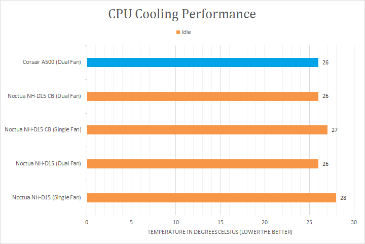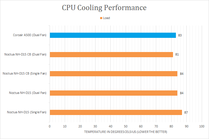We tested the Corsair A500 against the Noctua NH-D15 and Noctua NH-D15 chromax.black in single and dual fan configurations. The Noctua NH-D15 is one of the best, if not the best, air coolers in the market today, making it an interesting performance benchmark. In our charts, we noticed some difference between the regular NH-D15 and its chromax.black version. Possible explanations for the variances in results can be found in our Noctua NH-D15 chromax.black review. Noctua assures us all NH-D15 models sold today will have identical performance, so we will use the chromax.black version as the standard, since the regular NH-D15 used in our tests was made in 2014.