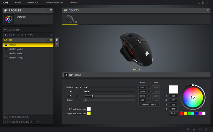 The Actions tab is where you can control the function of the buttons on your mouse. Options include macro, text, media, launch application, timer, disable, or profile switching for each button on the Dark Core RGB Pro. Key remaps can be set to keyboard inputs, language keys, or mouse buttons. The Lighting Effects tab is where you can play around with the... well, lighting effects of the Corsair Dark Core RGB Pro's nine independent illumination zones. Corsair's iCUE is designed to configure the colors by layer, where each layer can only be in one color or effect at a time. To get them to display different colors, you will have to create multiple layers. Lighting effects include options such as rainbow, color pulse, color shift, visor, rain, and rainbow wave. In the DPI page as shown in our screenshot above, you can configure the mouse's sensitivity to go from 100 DPI to 18,000 DPI at 1 DPI increments with three different sensitivity presets plus a sniper option. As a visual cue to the active sensitivity preset, an array of RGB LEDs on the left side of mouse are used to indicate current sensitivity. It starts with one LED at the bottom, and additional ones illuminate in ascending order to indicate the current active setting.