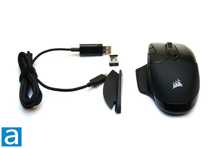 A small USB wireless transceiver is included, as shown in our photo above. It can be stored behind the interchangeable pinky grip for travel. Although the Corsair Dark Core RGB Pro is Bluetooth compatible, the transceiver provides support for the company's proprietary Slipstream wireless technology. According to Corsair, it is a low latency protocol with intelligent frequency switching for improved gaming performance. This is especially important for a wireless mouse.
