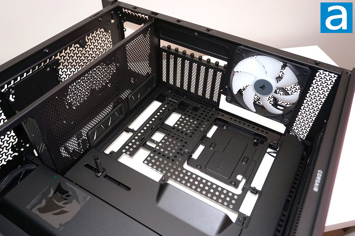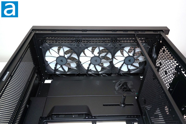 From the photo above, you can see another set of three Corsair RS140 ARGB PWM fans pre-installed from the factory. The front can accommdoate up to three 120mm, three 140mm, or two 200mm fans, or a radiator of equivalent size. In terms of cooling performance, this means the case already provides a solid solution right out of the box.