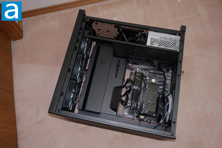 The build process with the Corsair Frame 5000D RS ARGB was extremely enjoyable. The layout is intuitive and follows a standard design, making it easy to work with from start to finish. I began by installing the power supply into the PSU chamber. For this build, I used the SilverStone Nightjar NJ700 700W. As a fanless unit, it relies heavily on case airflow, but thanks to the ventilation grille in the PSU chamber, sufficient airflow is provided to keep it running comfortably. Next, I installed a Thermaltake UX200 SE CPU cooler onto my Gigabyte GA-H170-D3HP motherboard. The motherboard tray cutout of the Frame 5000D RS ARGB aligned perfectly with the CPU socket, which made mounting the heatsink straightforward and hassle-free. I was also able to daisy-chain the ARGB connector of the CPU cooler’s fan with the included Corsair RS140 ARGB 140mm PWM fans, keeping the lighting setup neat and synchronized.