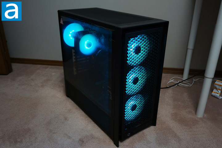 With everything installed, it was finally time to press the power switch. As shown in the photo above, the power button itself is the first thing to light up. Once powered on, the Corsair Frame 5000D RS ARGB delivers a striking ARGB LED lighting display. The wavy front mesh design allows the lighting effects to shine through with minimal obstruction, creating a clean and vibrant look. Personally, I place a lot of importance on noise levels in a PC build. In this setup, I had three fans running inside the case, and I was pleasantly surprised by how quiet the system was. Thanks in part to the thick tempered glass panel, which helps dampen sound. On a scale of 0 to 10, where 0 is completely silent and 10 is comparable to a jet taking off, I would rate this build at about 2.0/10 during normal operation. It is also worth noting that motherboard fan speed controls can reduce noise even further by lowering fan RPMs when the system is not under heavy load.