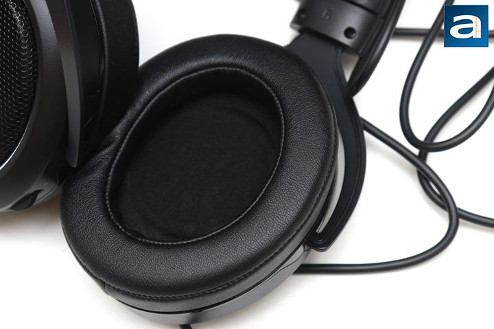 Moving up the cable, the next thing we come to are the two ear cups on the Corsair Gaming HS60 Surround. Much like we have seen recently, we have a memory foam earmuff covered by leatherette. I will say while the headset is pretty comfortable at this point, I did find the cushion of the ears to not be as great as some other headsets, such as the Kingston HyperX Cloud Stinger. I would have liked to see plushier foam here or an increased thickness in the muffs. The oval shape conforms naturally to a person's ear and the whole cup should be big enough to fit over most ear sizes. A thin mesh lining rests inside to ensure your ear does not touch the plastic underneath. Speaking of which, the drivers inside each ear cup are 50mm neodymium drivers. They feature a frequency response of 20Hz to 20kHz, covering the audible frequency spectrum for humans. Rated impedance of the unit is 32 ohms with a sensitivity of 111dB. These specifications are all the same as the HS50 Stereo, making me believe these are the same headset, though I cannot necessarily confirm this fact. Either way, we will see how all of this plays into the audio reproduction later on.