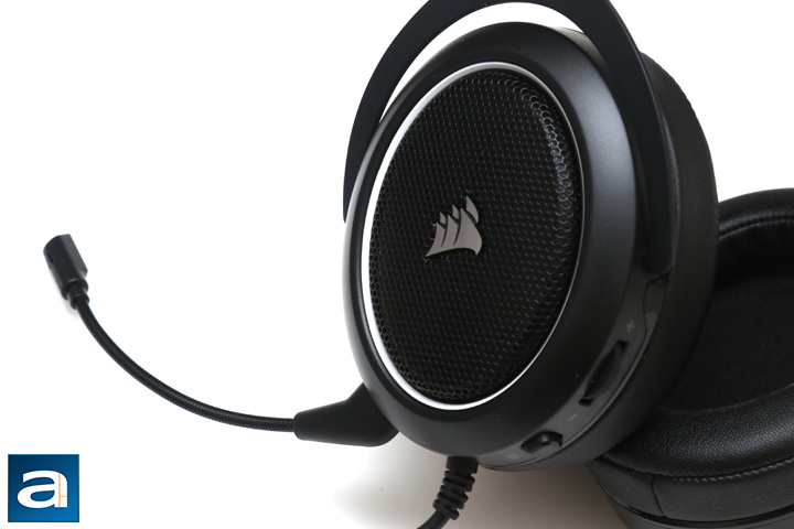 As we have mentioned, the left ear cup connects the headset to your preferred choice of audio, but it also connects and holds a few other things. The first thing I want to point out is the right most dial, which is the volume dial for the headset. Positive and negative indicators are printed on the headset to show which way the dial goes to increase or decrease the volume. The dial is pretty sensitive and loose, making volume adjustments fast. On the other hand, I would have liked to see a bit more resistance in the dial, as I found I would accidentally change the volume just by brushing my hand by it. Next to this dial is a push button, which allows you to mute the microphone. The button stays depressed when it is muted. Finally, we have the detachable microphone. This microphone is a unidirectional one with a frequency response of 100Hz to 10kHz. Besides the fact it is removable, I really like how flexible the microphone is. Not only can it swing in many directions, it also stays in place. According to Corsair, the whole headset is Discord Certified, which means the microphone and audio has been tested for communication and sound. Of course, we will see what that means in real life on our next page.