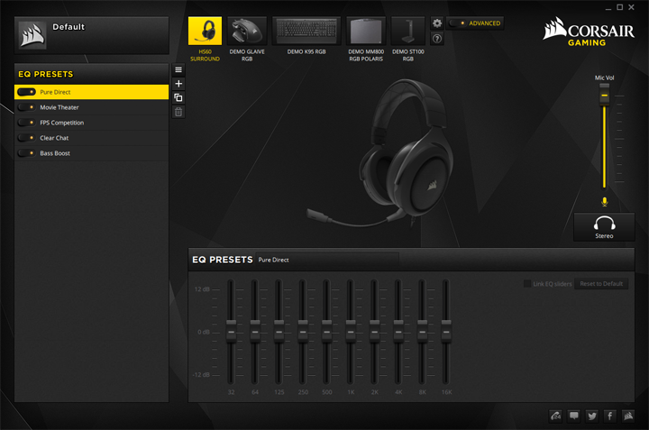 Corsair packages their CUE or Corsair Utility Engine software with the Corsair Gaming HS60 Surround, which is the same utility that works with all of the other Corsair products. While I wait the day for a unified software experience across multiple manufacturers, CUE is a pretty good application on its own. For the HS60 specifically, as it does not have any lighting effects, there are three main things you can do with this utility. For one, you can set the equalizer effects. Corsair does have several presets, but you can also set your own ones too. Secondly, you can set the volume of the microphone here, or mute it altogether. Finally, you can change the output between the default stereo or the virtual 7.1 surround sound. We will see how this works later in our audio analysis. However, it should be noted this utility only works when you use the included USB sound card, or else the headset will not be recognized as connected to your computer.
