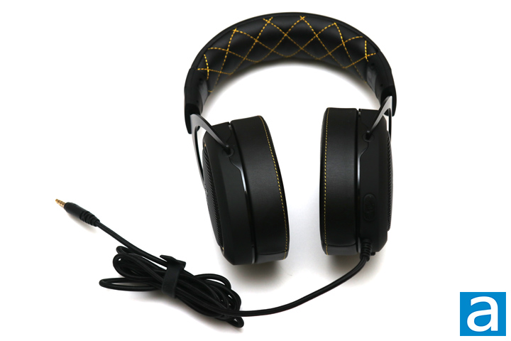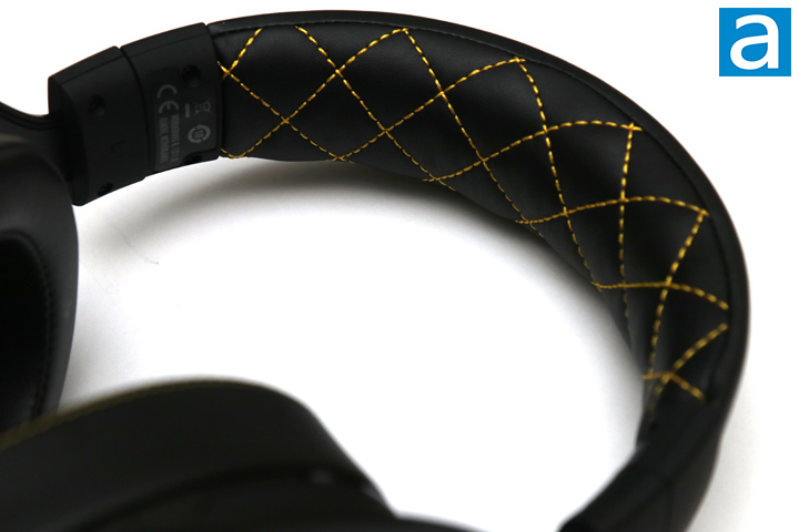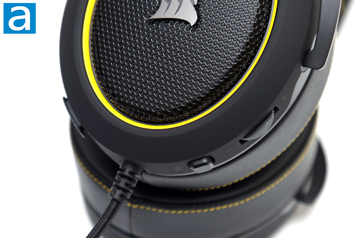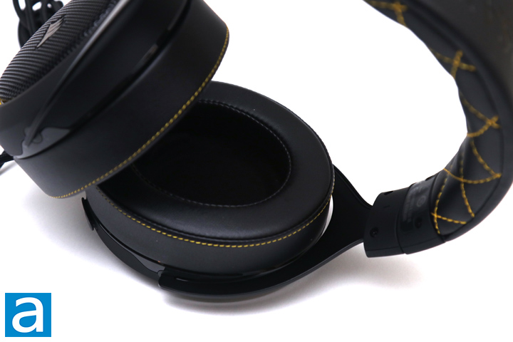 At the top of the headset, we have a leatherette headband with a yellow stitched pattern for some aesthetics. Once again, this is an eye-catching design choice that creates a bubble-like surface with individual pockets. Inside this headband cushion is memory foam, which feels similar to the foam used on the ears. As we already mentioned, the outer band is wrapped in leatherette with a Corsair imprint at the top. Down the side is where you will see the extending arms with an internal metal band to keep the headset sturdy. The frame is notched and marked with numbers so users can remember how much they need to extend the headset for a comfortable fit. There is enough resistance on the arms to prevent the cups from flying out whenever. As for how far the headset expands out, I have a big head and I felt like there was still a bit more room to extend, but I still recommend trying these headphones out first.