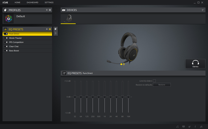 Corsair packages their iCUE software with the Corsair HS60 Pro Surround, which is the same utility that works with other Corsair products. While I wait the day for a unified software experience across multiple manufacturers, iCUE is a pretty good application on its own, albeit a large installation file at 349MB. For the HS60 Pro specifically, as it does not have any lighting effects, there are two things you can do with this utility. For one, you can set the equalizer effects. Corsair does have several presets, but you can also set your own ones too. Secondly, you can change the output between the default stereo or the virtual 7.1 surround sound. As expected, this utility only works when you use the included USB sound card, or else the headset will not be recognized as connected to your computer. While iCUE does not provide a whole lot of extras, it at least runs well and can integrate with your other supported Corsair products.