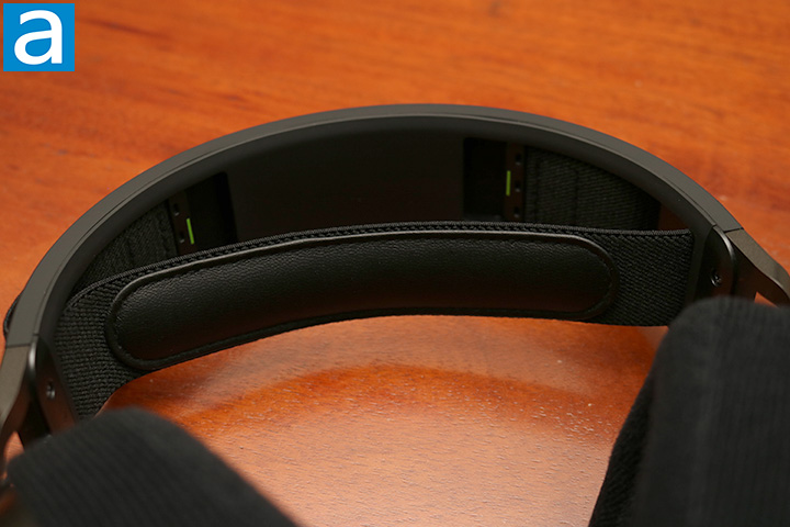 The headband for the Corsair HS80 RGB Wireless can be adjusted to fit different sized heads. In the picture above, you can see a small green line, which indicates where you can move the headband to be either tighter or looser. I find that this style of headband often hugs the top of your ear tighter than the bottom. I attempted to change the headband to different levels to compensate, but the same issue persists. It is not too noticeable, and your mileage may vary depending on your preference. However, the headband is well-made, and the adjustability should work well for many different users.